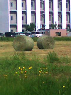 今日帰りがけにH大の構内、第二牧場のあるあたり(キャンパス北側ですね)を通っていたら、学内に牧草ロールがありました。